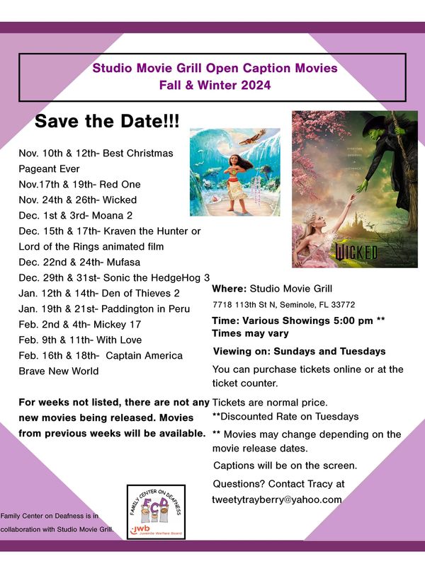Open captioned movies shown on Sunday and Tuesday, every other week. Movies generally start around 6;00 pm, but times vary so check out Studio Movie Grill ticketing for the accurate times.
