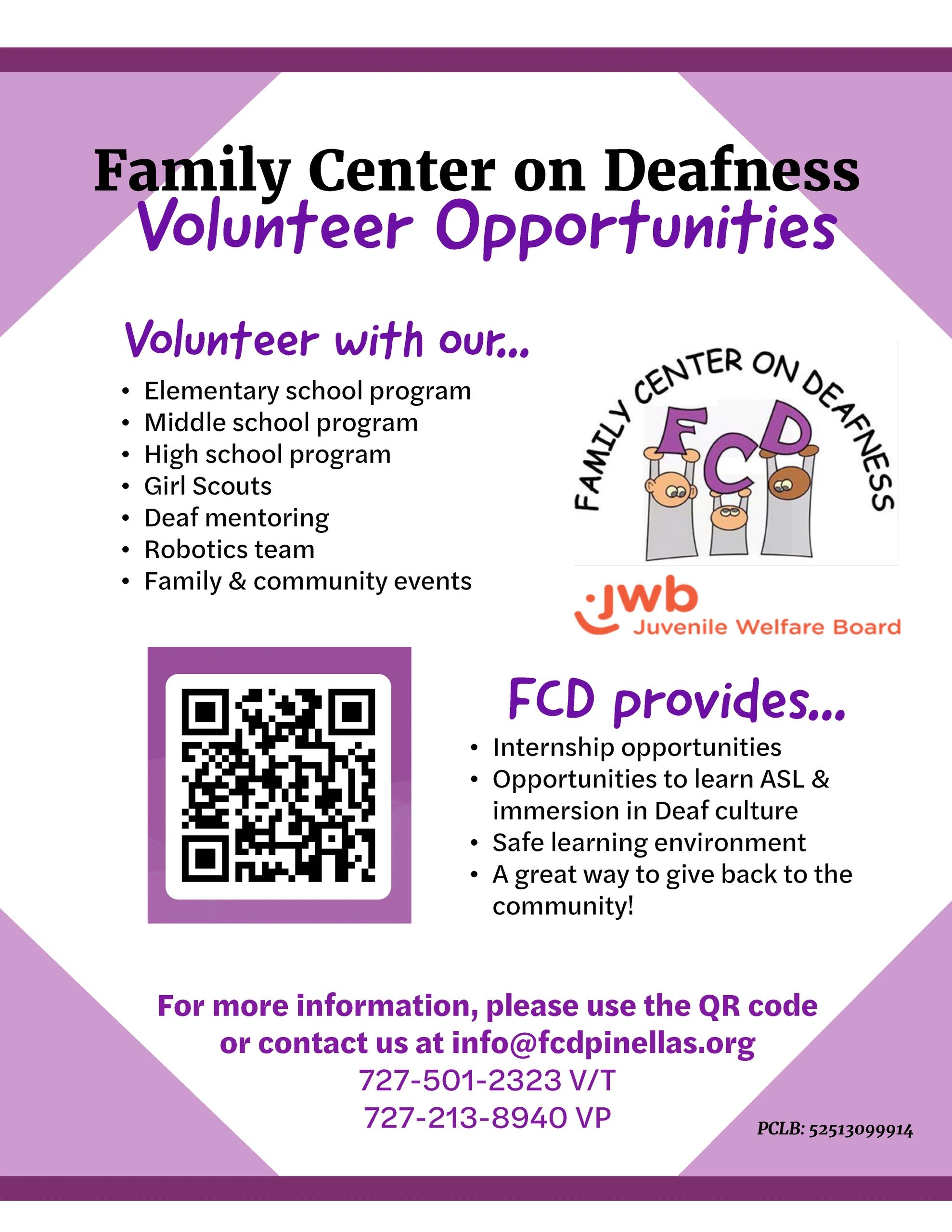 Family Center on Deafness is always looking for volunteers! If you have 3 hours, 1x month, help with the St. Pete Free Clinic Food pick up. More time? Join a program weekly. This is a great way to get contact hours for school.